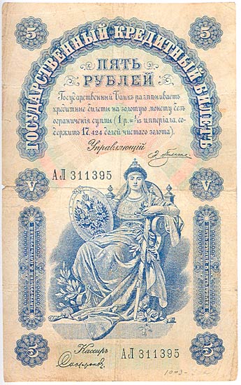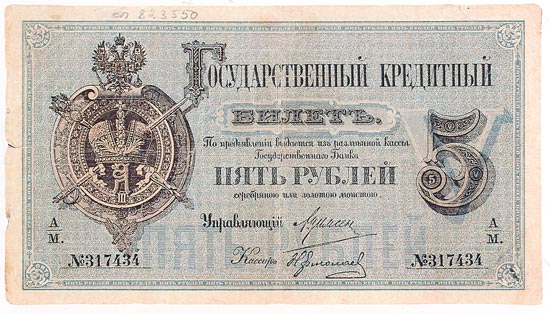 ![]() Государственный кредитный билет. 5 рублей. 1882. Размер 164х93 мм // Деньги России, 1000 лет / [А.С. Мельникова, В.В. Уздеников, И.С. Шиканова; Общ. ред.: А.С.Мельникова]. - М.: Родина: Фодио, 2000. - с. 134. |