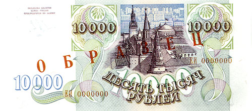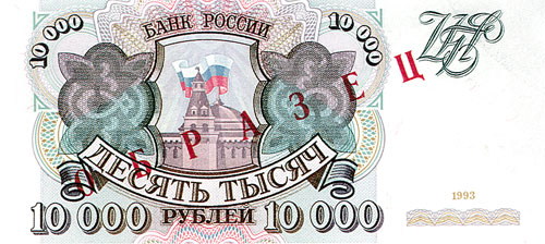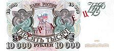 ![]() Билет банка России. 10000 рублей. 1993. Размер 152х67 мм // Деньги России, 1000 лет / [А.С. Мельникова, В.В. Уздеников, И.С. Шиканова; Общ. ред.: А.С. Мельникова]. - М.: Родина: Фодио, 2000. - с. 305. |