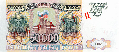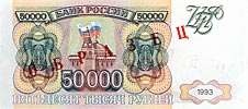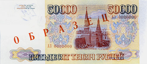 ![]() Билет банка России. 50000 рублей. 1993. Размер 152х67 мм // Деньги России, 1000 лет / [А.С. Мельникова, В.В. Уздеников, И.С. Шиканова; Общ. ред.: А.С. Мельникова]. - М.: Родина: Фодио, 2000. - с. 306. |
