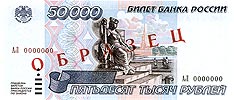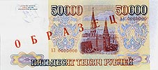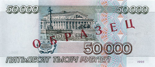 ![]() Билет банка России. 50000 рублей. 1995. Размер 152х65 мм // Деньги России, 1000 лет / [А.С. Мельникова, В.В. Уздеников, И.С. Шиканова; Общ. ред.: А.С. Мельникова]. - М.: Родина: Фодио, 2000. - с. 308. |