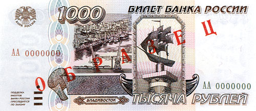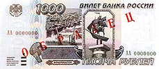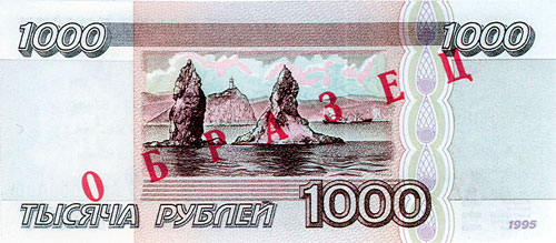 ![]() Билет банка России. 1000 рублей. 1995. Размер 137х62 мм // Деньги России, 1000 лет / [А.С. Мельникова, В.В. Уздеников, И.С. Шиканова; Общ. ред.: А.С. Мельникова]. - М.: Родина: Фодио, 2000. - с. 306. |