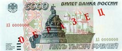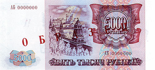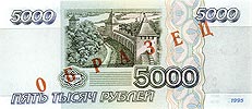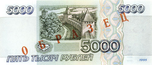 ![]() Билет банка России. 5000 рублей. 1995. Размер 137х62 мм // Деньги России, 1000 лет / [А.С. Мельникова, В.В. Уздеников, И.С. Шиканова; Общ. ред.: А.С. Мельникова]. - М.: Родина: Фодио, 2000. - с. 307. |