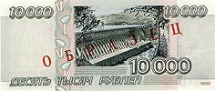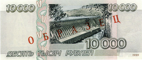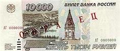 ![]() Билет банка России. 10000 рублей. 1995. Размер 137х62 мм // Деньги России, 1000 лет / [А.С. Мельникова, В.В. Уздеников, И.С. Шиканова; Общ. ред.: А.С. Мельникова]. - М.: Родина: Фодио, 2000. - с. 307. |