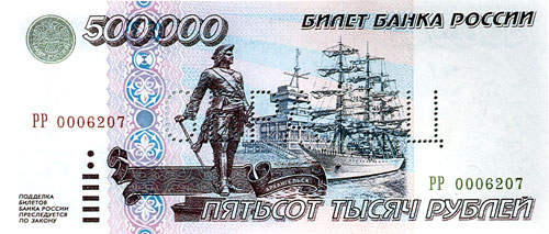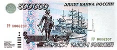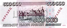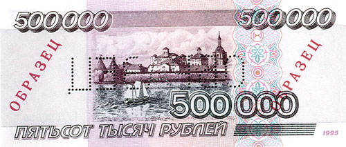 ![]() Билет банка России. 500000 рублей. 1995. Размер 152х65 мм // Деньги России, 1000 лет / [А.С. Мельникова, В.В. Уздеников, И.С. Шиканова; Общ. ред.: А.С. Мельникова]. - М.: Родина: Фодио, 2000. - с. 308. |