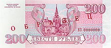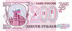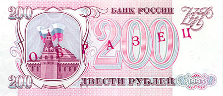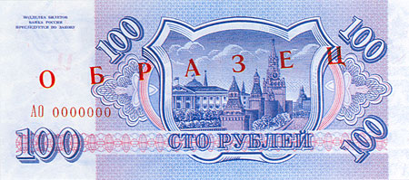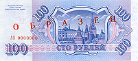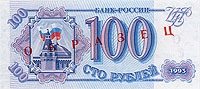 ![]() Билет банка России. 100 рублей. 1993. Размер 130х57 мм // Деньги России, 1000 лет / [А.С. Мельникова, В.В. Уздеников, И.С. Шиканова; Общ. ред.: А.С. Мельникова]. - М.: Родина: Фодио, 2000. - с. 302.