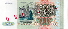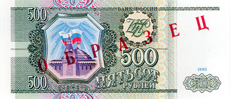 Билет банка России. 500 рублей. 1993. Размер 130х57 мм // Деньги России, 1000 лет / [А.С. Мельникова, В.В. Уздеников, И.С. Шиканова; Общ. ред.: А.С. Мельникова]. - М.: Родина: Фодио, 2000. - с. 303. |