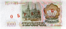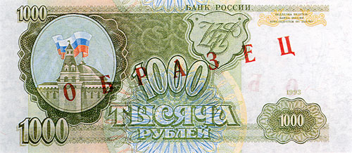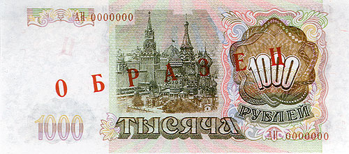 ![]() Билет банка России. 1000 рублей. 1993. Размер 152х67 мм // Деньги России, 1000 лет / [А.С. Мельникова, В.В. Уздеников, И.С. Шиканова; Общ. ред.: А.С. Мельникова]. - М.: Родина: Фодио, 2000. - с. 304. |
