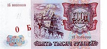 Билет банка России. 5000 рублей. 1993. Размер 152х67 мм // Деньги России, 1000 лет / [А.С. Мельникова, В.В. Уздеников, И.С. Шиканова; Общ. ред.: А.С. Мельникова]. - М.: Родина: Фодио, 2000. - с. 304. |