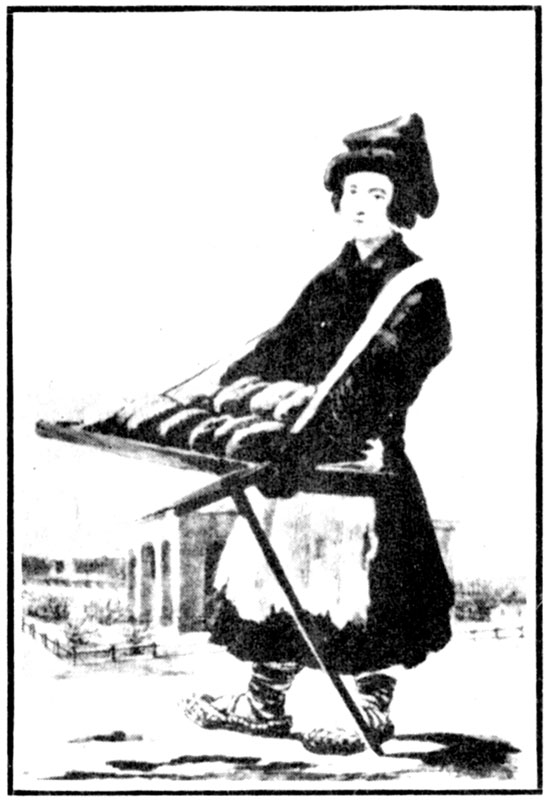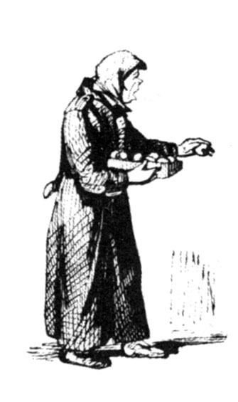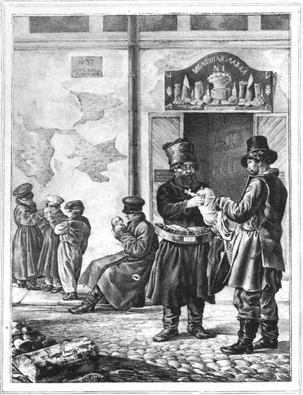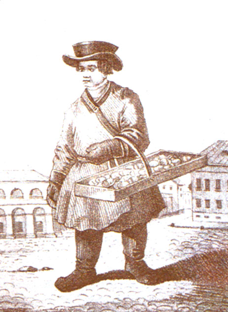 Продавец гречневых пирогов: Литография с рис. А.Орловского 1823 год // Гермес: Торговля и реклама: Сборник. – СПб., 1994 | Игра в пристенки (разносчики) // Костюм народов России в графике XVIII-XX веков из фондов Государственной центральной театральной библиотеки. – М., 1990 |