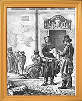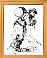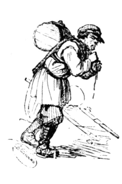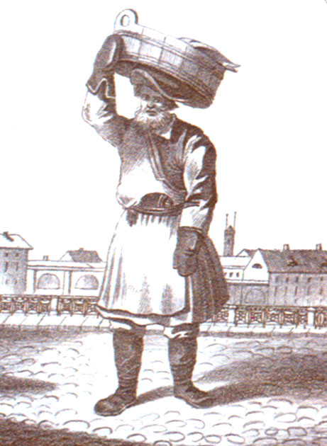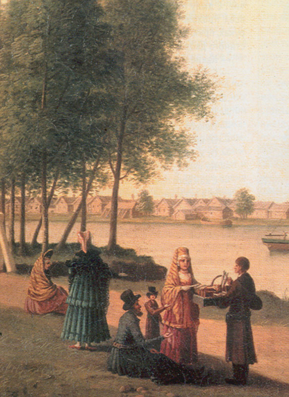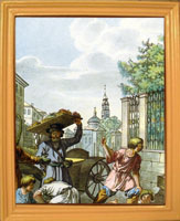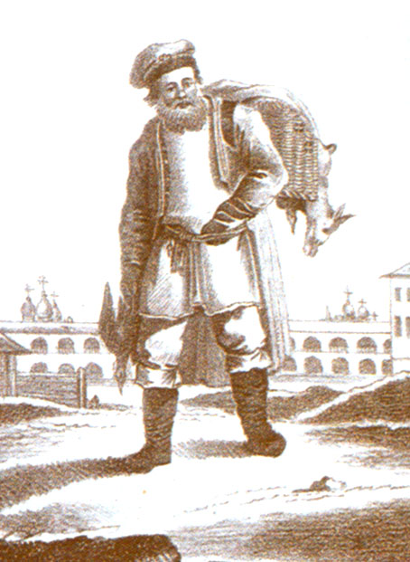 Разносчик рыбы 1825 год // Л.Мясникова. «С кувшином охтенка спешит…». – В ж.: Родина. – 2003. - №4 | Разносчик книг (офеня). Деталь картины Б.Патерсена «Вид Новой деревни с Каменного острова» // Л.Мясникова. «С кувшином охтенка спешит…». – В ж.: Родина. – 2003. - №4 |