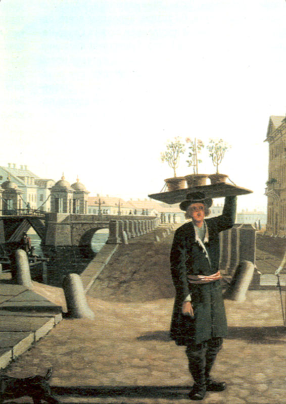 | Разносчик цветов в горшках. Деталь картины Б.Патерсена.»Вид набережной Фонтанки у Аничкова моста» // Л.Мясникова. «С кувшином охтенка спешит…». – В ж.: Родина. – 2003. - №4 | ![]() |