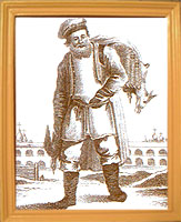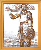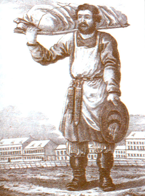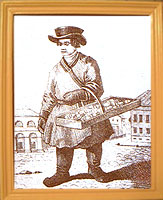 | Разносчик с хлебом 1825 год // Л.Мясникова. «С кувшином охтенка спешит…». – В ж.: Родина. – 2003. - №4 | ![]() |