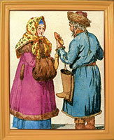 | Рыбак и разносчик дичи // Волшебный фонарь или Зрелище С.-Петербургских расхожих продавцов, мастеров и других простонародных промышленников, изображенных верною кистию в настоящем их наряде, и представленных разговаривающими друг с другом, соответственно каждому лицу и званию. Ежемесячное Издание на 1817 год. - СПб., в типографии В. Плавильщикова, 1817 год. - с. 87. | ![]() |