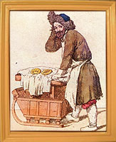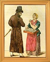 | Торговка и еврей // Волшебный фонарь или Зрелище С.-Петербургских расхожих продавцов, мастеров и других простонародных промышленников, изображенных верною кистию в настоящем их наряде, и представленных разговаривающими друг с другом, соответственно каждому лицу и званию. Ежемесячное Издание на 1817 год. - СПб., в типографии В. Плавильщикова, 1817 год. - с. 26. | ![]() |