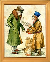 | Разносчик книг и сочинитель // Волшебный фонарь или Зрелище С.-Петербургских расхожих продавцов, мастеров и других простонародных промышленников, изображенных верною кистию в настоящем их наряде, и представленных разговаривающими друг с другом, соответственно каждому лицу и званию. Ежемесячное Издание на 1817 год. - СПб., в типографии В. Плавильщикова, 1817 год. - с. 180. | ||