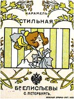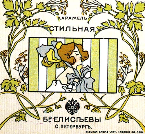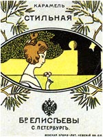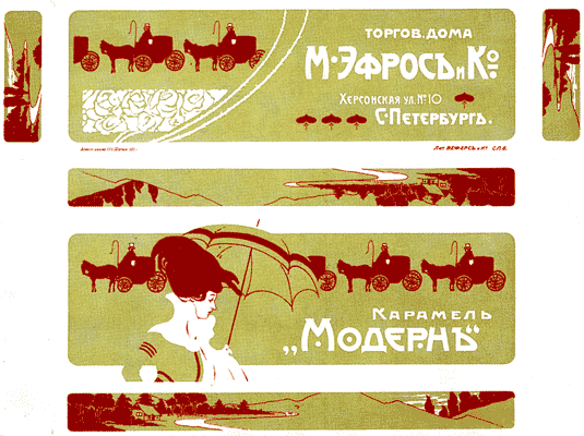 ![]() Неизвестный художник. Серия оберток карамели "Стильная". СПб., 1900-е годы. 7,5х8,5 см // Русский графический дизайн / Авт. текста: Е.Черневич; Сост.: М.Аникст, Н.Бабурина; Дизайн: М. Аникст. - М. : Внешсигма, Б.г. (1997). - с. 62. |