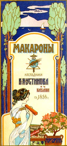 ![]() Неизвестный художник. Макароны. Наследники В. Я. Устинова в Казани. Плакат. Казань, 1902. 55х26 см // Русский графический дизайн / Авт. текста: Е.Черневич; Сост.: М.Аникст, Н.Бабурина; Дизайн: М. Аникст. - М. : Внешсигма, Б.г. (1997). - с. 57. |