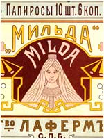 ![]() Неизвестный художник. Мильда. Папиросы Товарищества Лаферм. Плакат. СПб., 1904. 27,5х46 см // Русский графический дизайн / Авт. текста: Е.Черневич; Сост.: М.Аникст, Н.Бабурина; Дизайн: М. Аникст. - М. : Внешсигма, Б.г. (1997). - с. 60. |