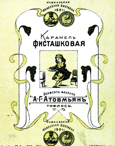 ![]() Неизвестный художник. Обертка карамели "Фисташковая". СПб., 1903. 8х6 см // Русский графический дизайн / Авт. текста: Е.Черневич; Сост.: М.Аникст, Н.Бабурина; Дизайн: М. Аникст. - М. : Внешсигма, Б.г. (1997). - с. 62. |