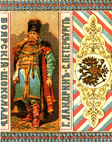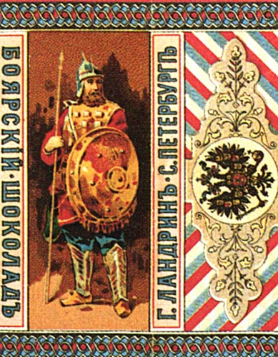![]() Неизвестный художник. Обертка шоколада "Боярский". СПб., 1900-е годы, 8,5х7 см // Русский графический дизайн / Авт. текста: Е.Черневич; Сост.: М.Аникст, Н.Бабурина; Дизайн: М. Аникст. - М. : Внешсигма, Б.г. (1997). - с.27. |
