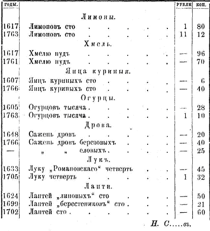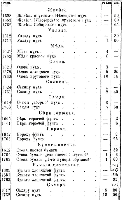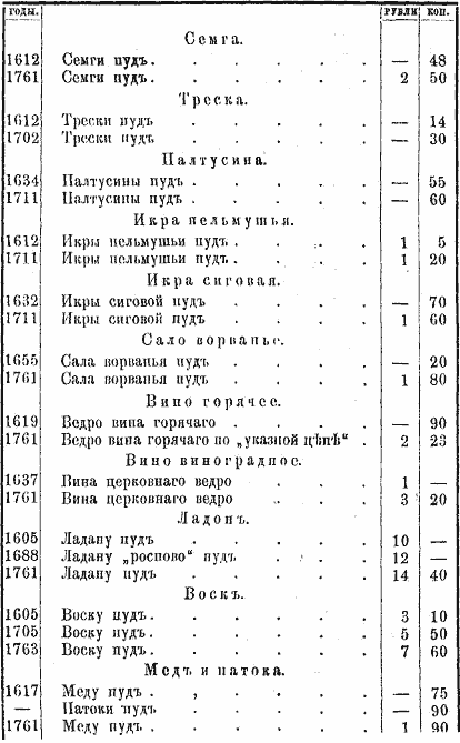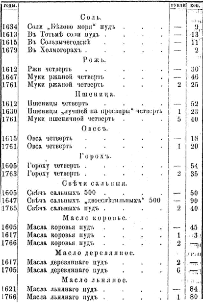 потребности Частично сохранена орфография оригинала Предлагаемыя в настоящей статье сведения о ценах извлечеы из современных местных письменных документов XVII и XVIII столетий, а именно: из приходо-расходных книг Вологодскаго apxиpескаго дома, из таких же книг Вологодскаго Спасоприлуцкаго монастыря и из разных других архивных современных записей. Официальность документов, на которых основаны показания этой статьи, т.е. приходо-расходных книг, подвергавшихся контролю самих архиереев вологодских и настоятелей Спасоприлуцкаго монастыря, или их поверенных, ручается за верность этихъ показаний. Для удобнейшаго и, так сказать, нагляднаго сравнения цен в разных годах, вес и количество однородных предметов приведены нами, по возможности, к однообразным, наиболее употребляющимся в современной торговле, единицам: четвертей, пудов, фунтов, тысяч, сотен и пр. Так на прим., хлебные припасы: рожь, пшеница, овес, означены четвертями; соль, рыба, воск, ладон, железо — пудами; порох — фунтами, сальныя свечи, куриные яйца—сотнями. Старинных цен с нынешними, в нашей таблице старинные «алтаны» и «денежки» переложены на рубли и копейки. Таблица цен