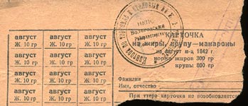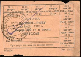 Норма в месяц: мясо-рыба - 500 гр, крупа - 600 гр, жиры - 200 гр, сахар и кондитерские изделия - 200 гр