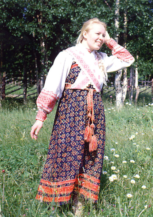 Конец XIX века. Вологодская губерния, среднее течение реки Вычегды. Рубаха. Льняное полотно, кумач, браное, выборное ткачество. Сарафан троелишный. Лен, набойка, кумач, вышивка. Косынка-косяк. Льняное полотно, браное, выборное ткачество. Пояс. Лен, шерсть, стеклярус, поволока, тканье в бердышке. Костюм выполнен в традициях одежды Вологодской губернии. Ворот – короткую рубаху шили на архаичной туникообразной кокетке с подкладом и воротником-стойкой. Застежка на планке. Орнаментация ворота в виде полосы браного ткачества, пристроченной по линии кокетки. В этой же технике декорированы нижняя часть рукавов и манжеты. Сочетание густого узора в виде городчатых ромбов и свастик с разреженным орнаментом в виде стилизованных растений является особенностью оформления одежды этих мест. Полоса орнамента на косякс позволяет объединить две детали костюма в единый ансамбль. Трехцветная набойка сарафана делала его живописным. Такие сарафаны называли троелишными. Узор «рябинки» наносили оранжевой масляной краской. По низу сарафана – полоски кумача с вышивкой крестом синими, сиреневыми, зелеными нитями. Женские пояса здесь отличались сложностью завершения концов. В оформлении использовали проволоку, стеклярус. Местные жители различали пояса с прибасками, с королечками, с кисточками. Ансамбль отличался сочностью красок, яркостью. Все детали комплекта выполнены из ткани домашнего изготовления |