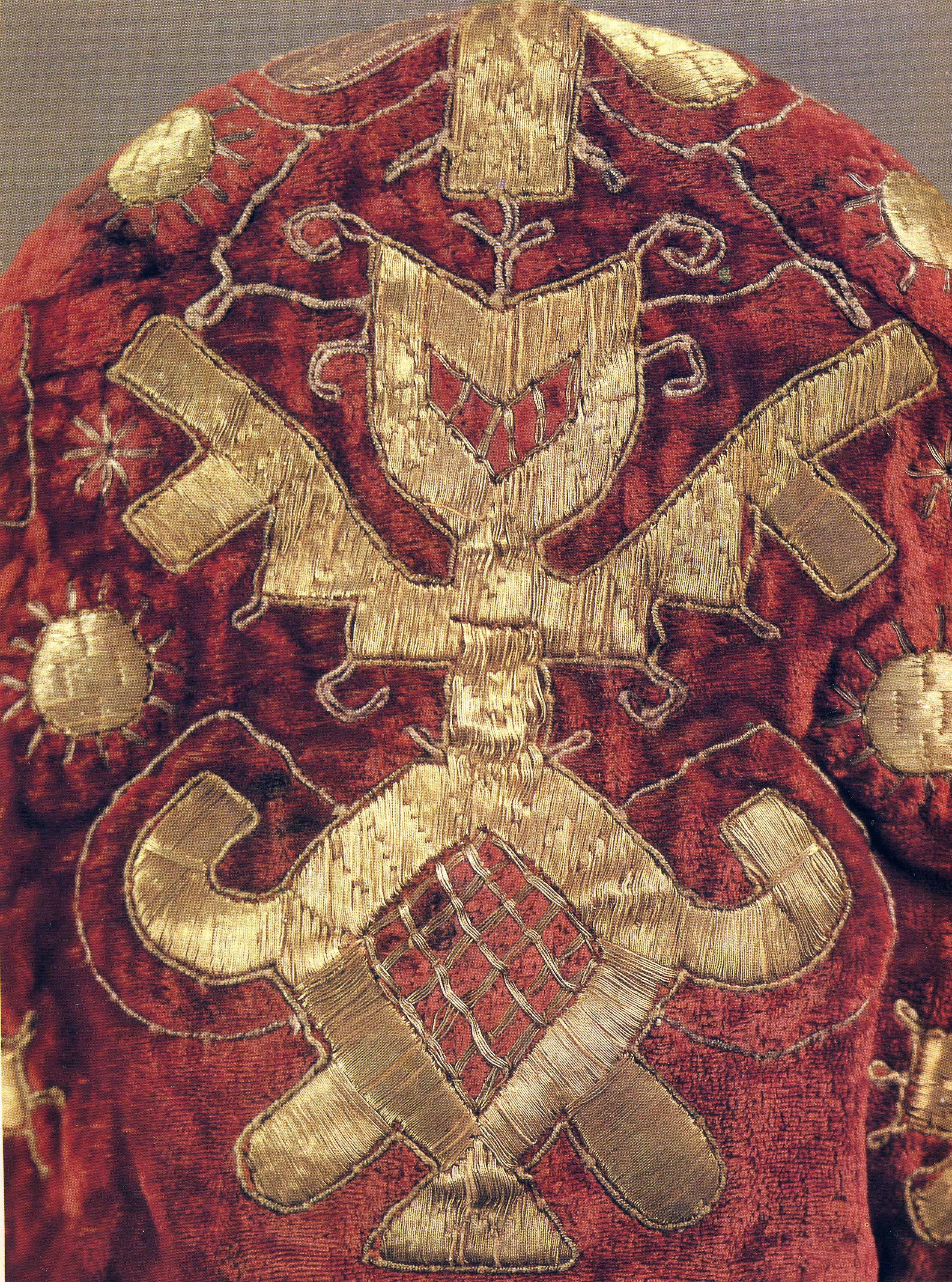 Сольвычегодский уезд, Вологодская губ. XIX в. Холст, ткань шёлковая, вышивка золотными нитями
