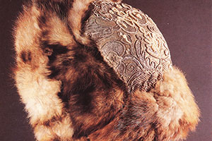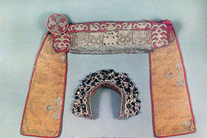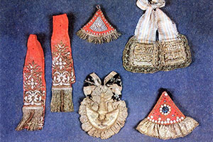 Конец XIX в. Вол. губ., Великоуст. у., с. Сухона. Штоф, ситец (метал. шнур, жемчуг, бисер, шитье, стекла в гнездах, золотое шитье. Выс. 15, шир. 25