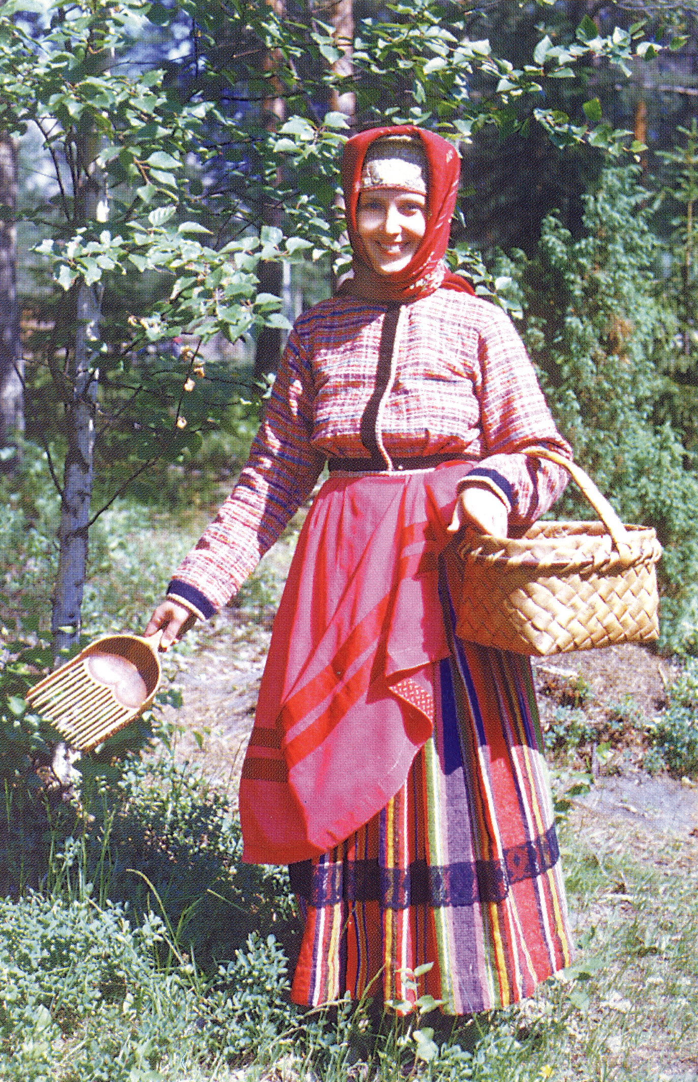 Начало XX века. Вологодская губерния Кофта-рукава. Шерсть, лен, бархат, сатин, тесьма, ремизное ткачество Сарафан-дольник. Шерсть, крашенина, машинное кружево, тесьма, ткачество Головной убор – сборник. Холст, картон (основа), кумач, ситец, шитье золотными нитями Платок. Ситец, фабрика Баранова В комплекте данного женского костюма проявлялась взаимосвязь различных групп населения. Бытование в этих местах сарафана-дольника – отголоски одежды служилых людей, выходцев из западных регионов России – однодворцев. Полихромный узор дольника состоял из продольных полос различной ширины. Рисунок получался за счет применения широких берд на ткацком стане. Распашная кофта до талии – рукава – изготовлена из полушерстяной ткани ремизного ткачества. Узор имел ярко выраженную рельефную структуру и состоял из мелких клеток. Отделка черным бархатом, сложный крой кофты с втачными рукавами – свидетельста проникновения в деревенский быт элементов городской моды. Передник шили преимущественно из покупной ткани и завязывали высоко под грудью |