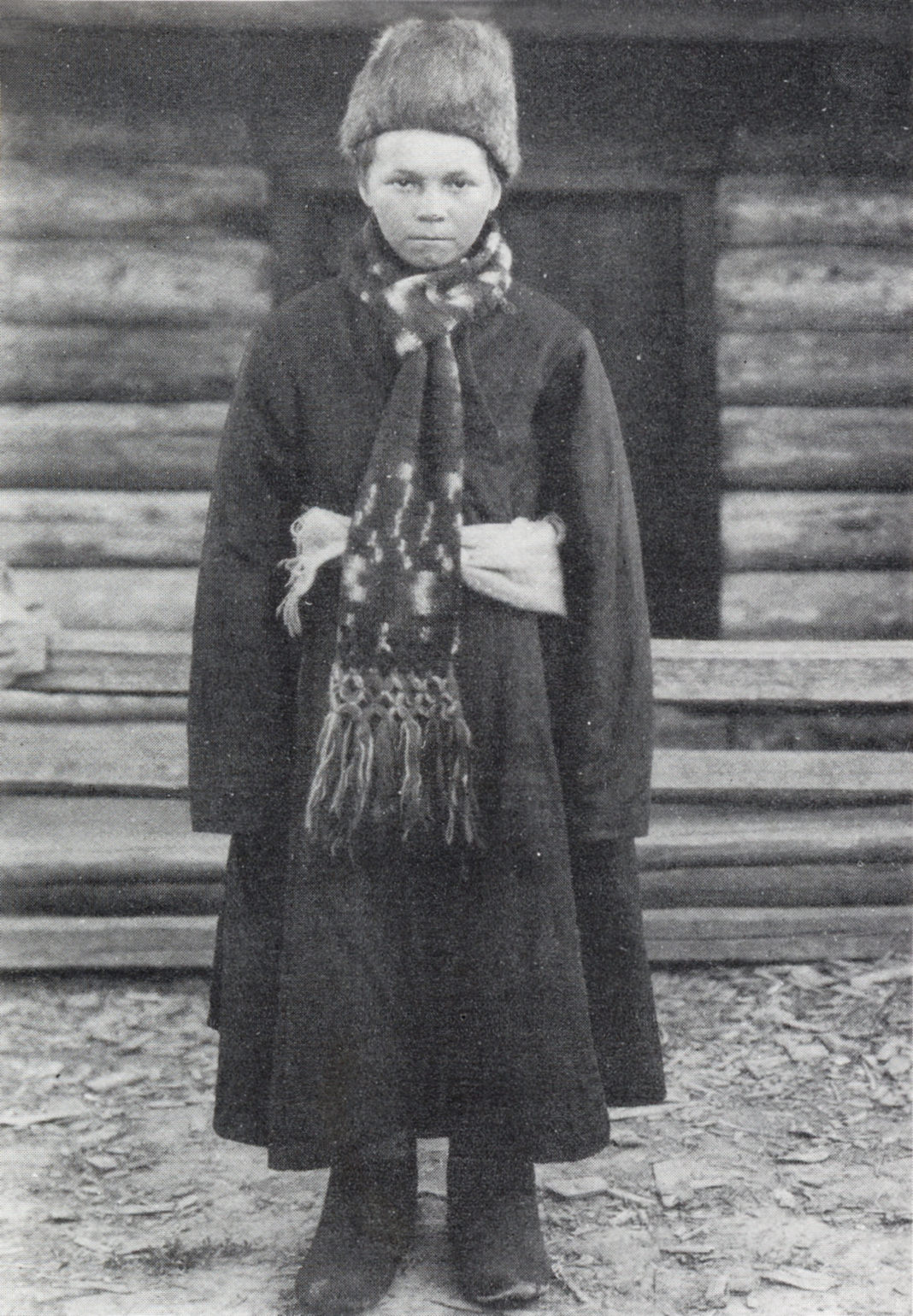 Подросток в верхней одежде: меховой шапке, азяме с кушаком, вязаном шарфе, валенках. 1911. Фотография. Вологодская губ., Сольвычегодский у.