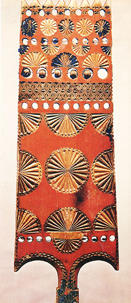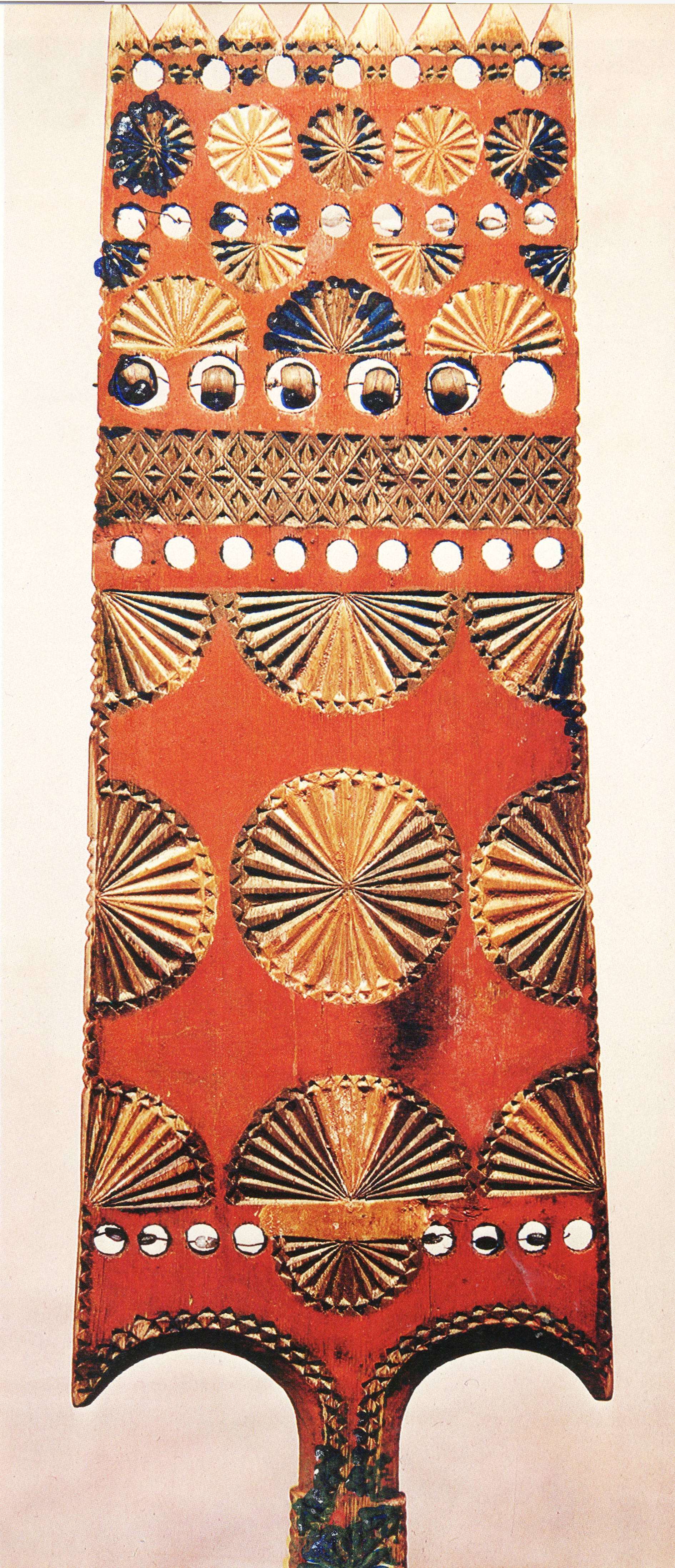 Конец 19 века. Вологодская область, Нюксенский район, деревня Березовая слободка на реке Сухоне Трехгранновыемчатая и сквозная резьба, роспись Лопасть нюксенской прялки с характерным для этого района узором из розеток и рядами сквозных круглых отверстий, куда вставлялись бусинки и цветные камешки, издававшие при каждом движении прялки звук. Прялка «с ожерельями», как ее называют в Нюксенском районе, вошла в моду во второй половине 19 века. Прялки Нюксеницы ярко и многоцветно расписывались по резьбе масляными красками |