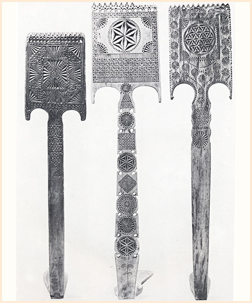 Конец 19 века. Вологодская область, Тотемский район, деревня Ивакино около Погорелова. Мастер Николай Васильевич Кучин Прялка. Вторая половина 19 века. Вологодская область, Сокольский район, деревня Биряково Прялки Погорелова, Чучкова и Бирякова – это три разновидности тотемских прялок: корневых, на высокой ножке, с квадратной лопастью (северный тип прялки). Все три центра стоят на древнем тракте Вологда – Тотьма, чем и объясняется близость форм их прялок. В классификацию А. А. Бобринского не вошли). Местное название – «пресница» Особенно яркое различие они имеют в оформлении ножек. У прялок Погорелова узор с лопасти редко спускается на прямую стройную ножку, у прялок Чучкова вся ножка от лопасти до основания резная и кажется составной из узорных квадратов и кругов, у прялок Бирякова резной узор лопасти заходит только на верхнюю часть ножки, подчиняя ее силуэт своему ритму. Позднее в Бирякове появились прялки, которые вместо резьбы красились под красное дерево, украшались накладными пластинами меди, кусочками зеркала и медными бляшками, издававшими звон при малейшем ее колебании. Делала эти прялки семья местных мастеров гармошек |