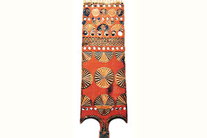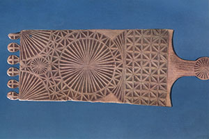 Начало XX в. Дерево, резьба, окраска., д. Емельянов Дор, Емельяновский с/с, Кичменгско-Городецкий р-н. Лопастка прялки украшена резным о // Горбатова Т. В. Росписи Вологодской земли : методическое пособие. Кичменгско-Городецкая роспись. – Вологда, 2011. – C. 21.
