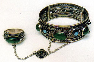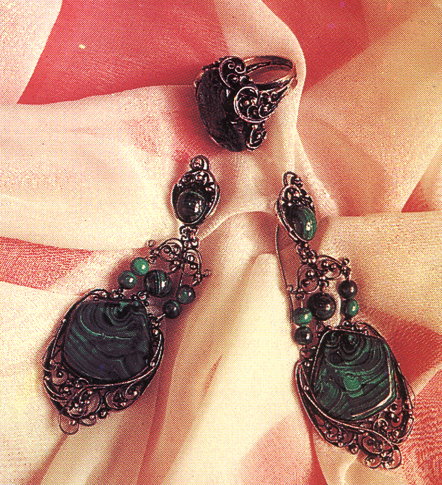 В. В. Попов. Ювелирный гарнитур «Надежда» (серьги, кольцо). Малахит, металл, филигранъ, зернь