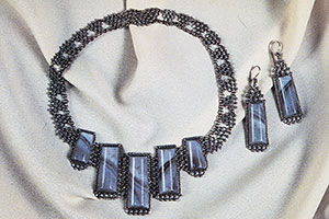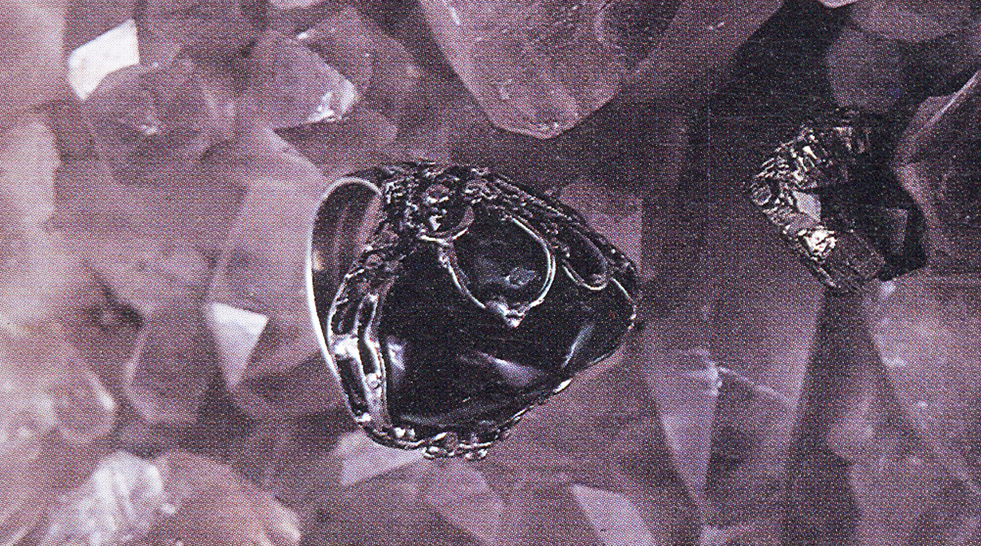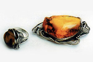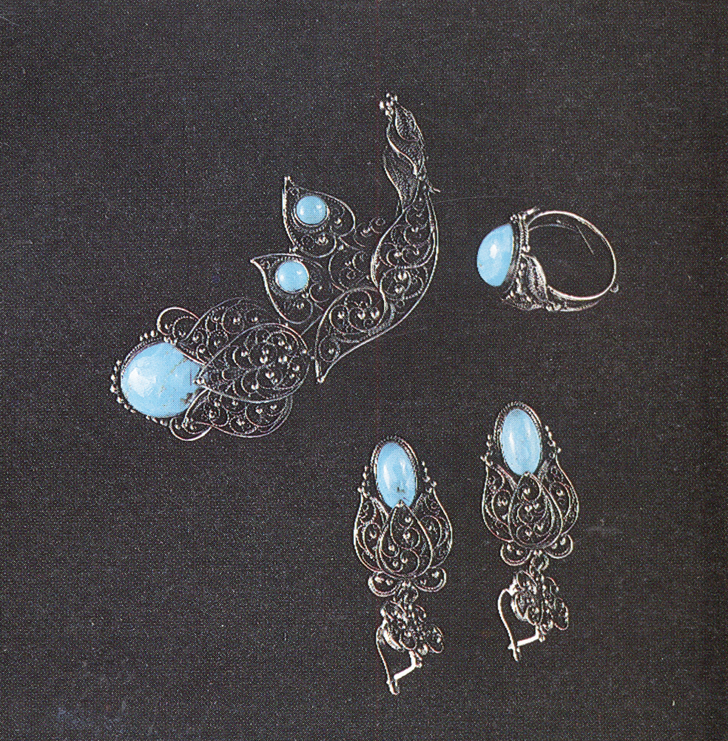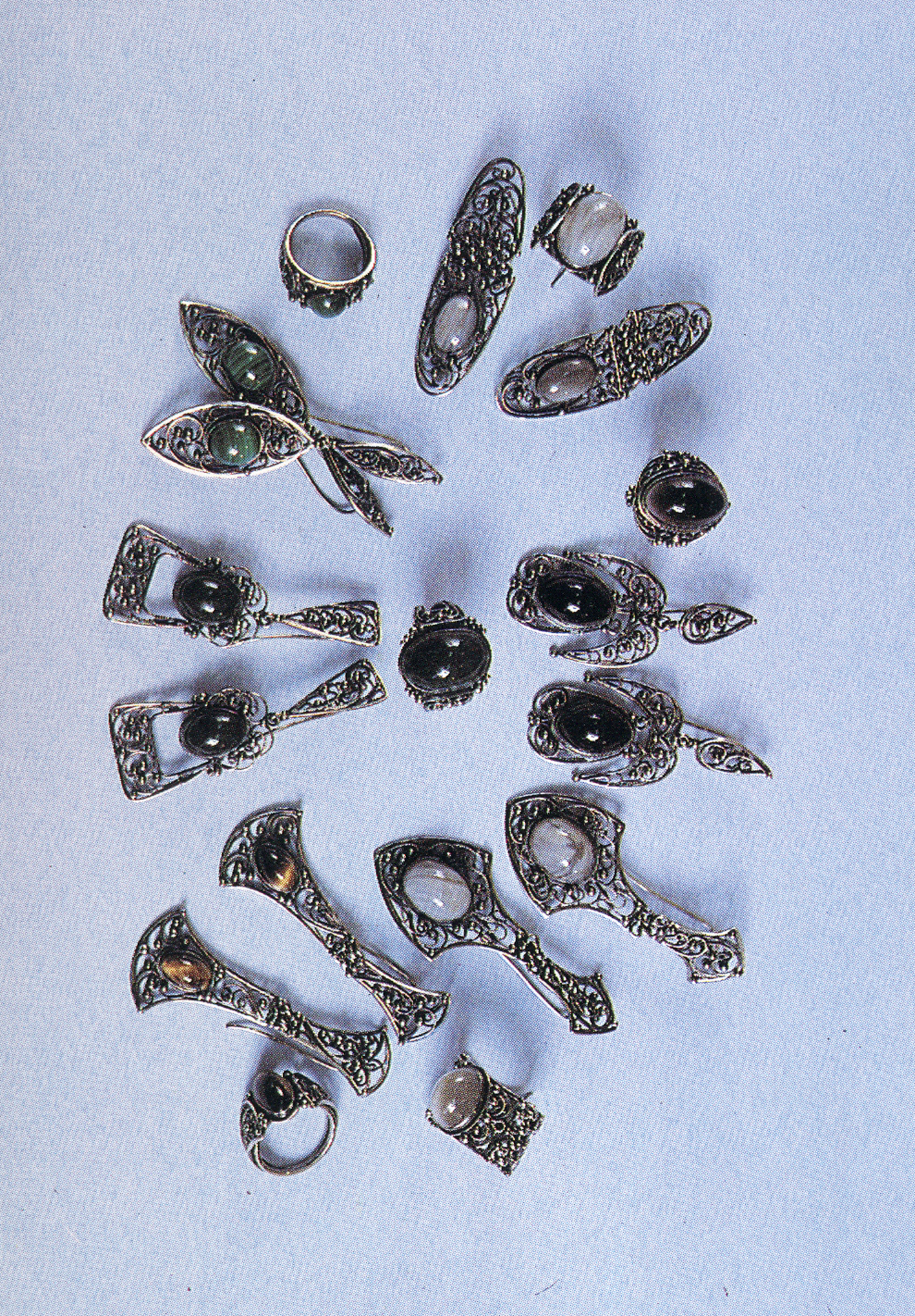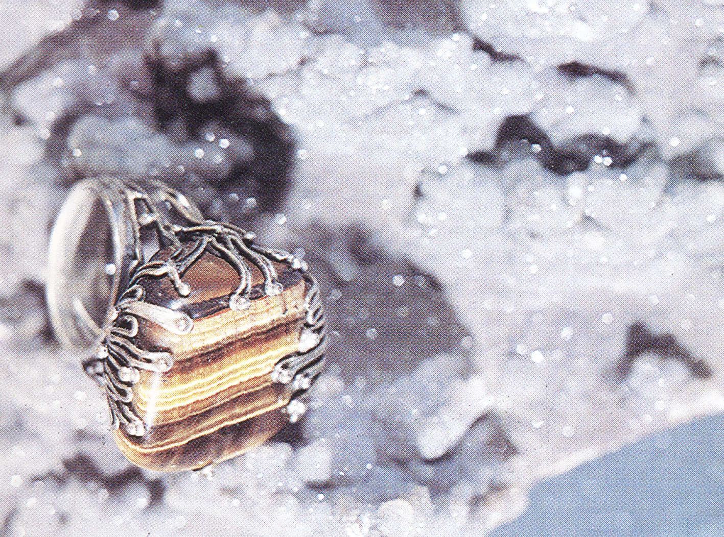 В.В. Попов. Ювелирный гарнитур «Тигровый глаз» (брошь, серьги, кольцо). Тигровый глаз, металл, филигрань, зернь