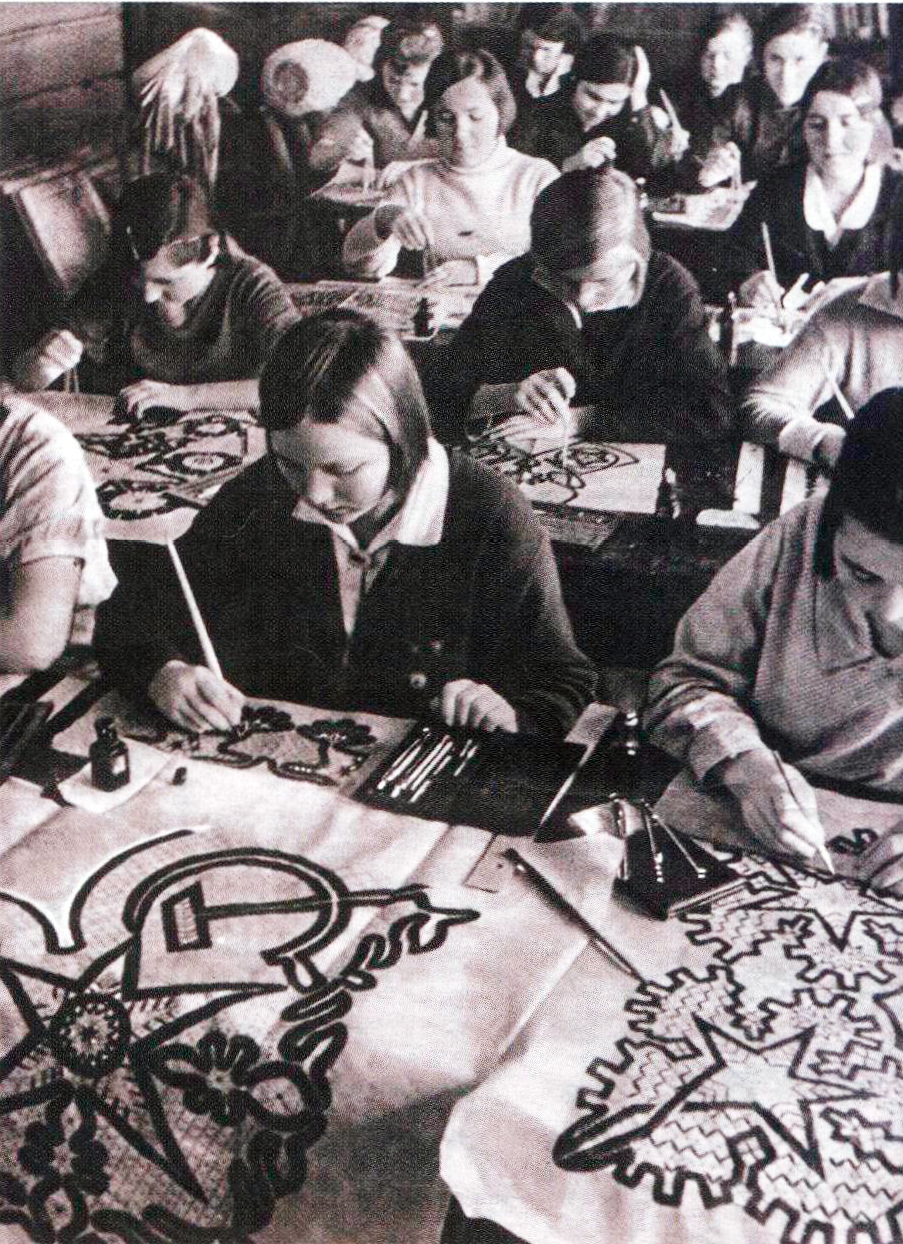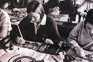 Ученицы Вологодской кружевной школы за проработкой своих рисунков. 1937 г.