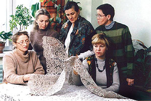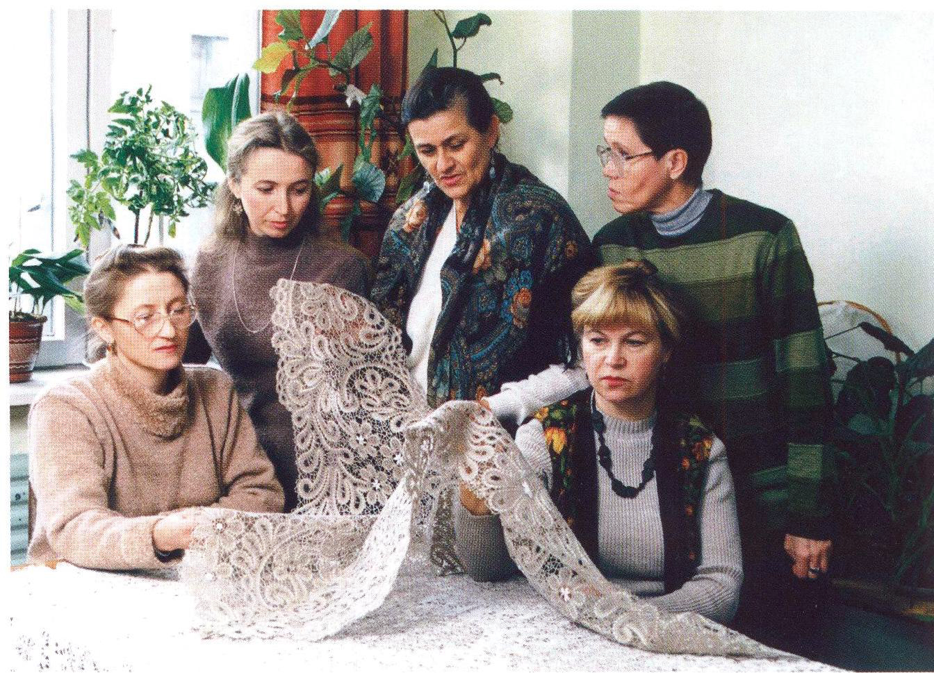 Художники кружевного предприятия. 1990 г. (Слева направо: Н.В. Веселова, Т.Н. Смирнова, Г.Н. Мамровская, Л.П. Касимирова, А.Н. Ракчеева)