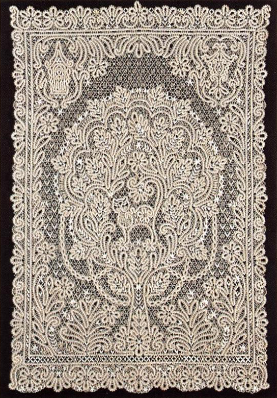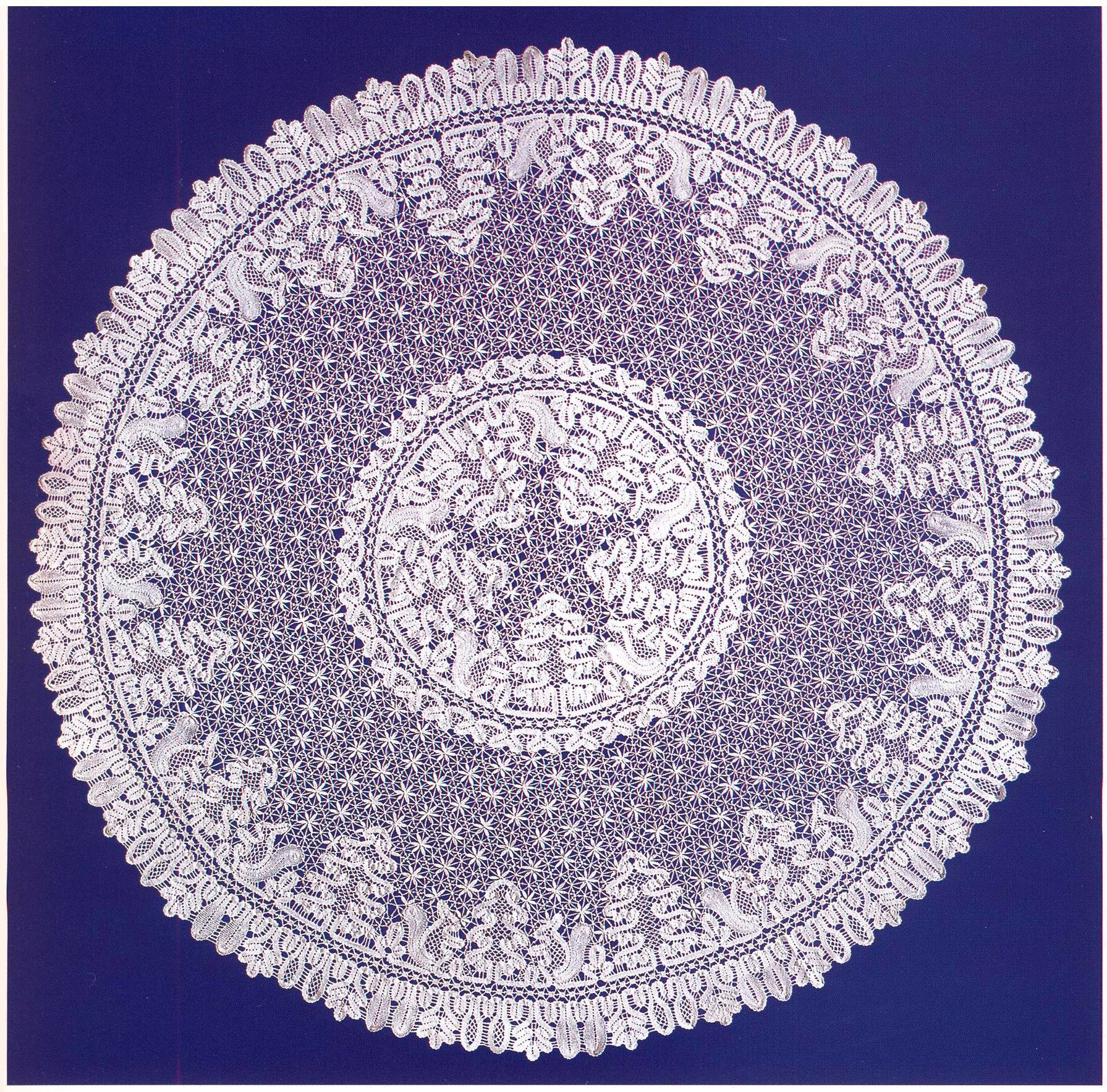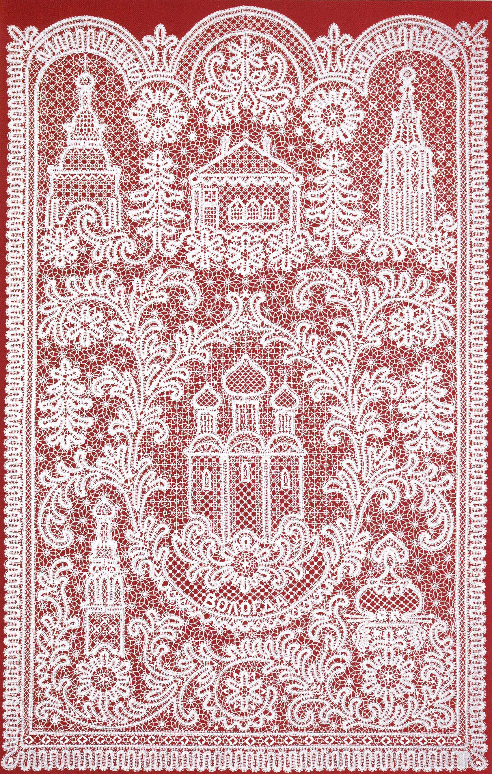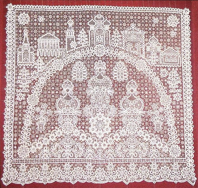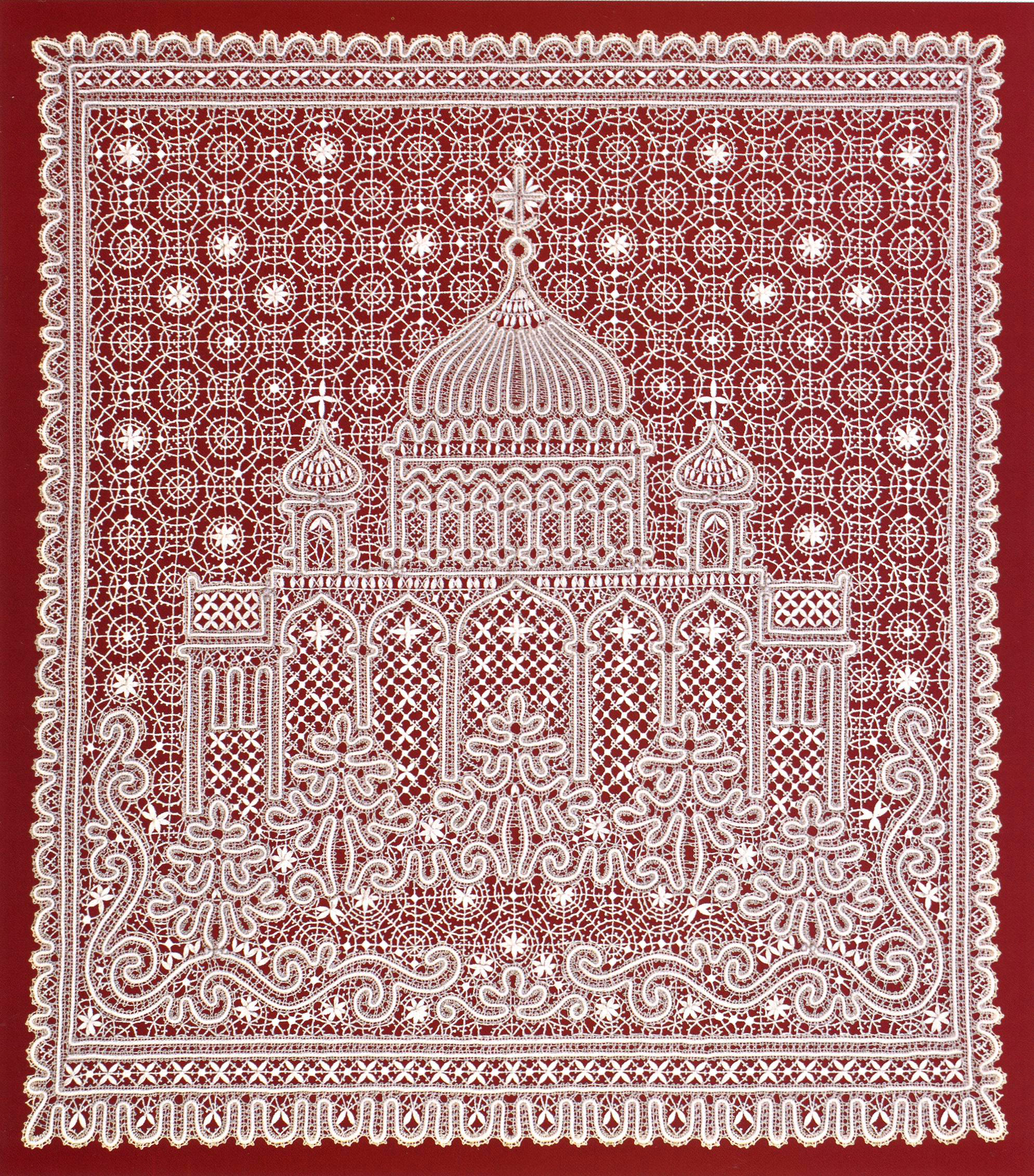 Веселова Н. В. Род. 1952. Вологда. Скатерть «Град на острове стоит». 1999. Лен, ручное кружевоплетение