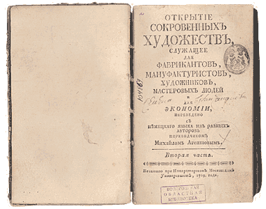 (1740-1769). Открытие сокровенных художеств, : Служащее для фабрикантов, мануфактуристов, художников, мастеровых людей и для экономии. / Переведено с немецкаго языка из разных авторов переводчиком Михайлом Агентовым. – [Москва] : Печ. при Имп. Моск. ун-те , 1768 – 177 ;8°. – СК XVIII № 57. – На тит. л. владел. запись Семена Брянчанинова, фамильная печатка Брянчаниновых.