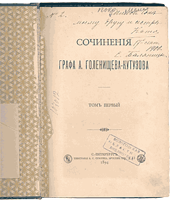 122. Голенищев-Кутузов, Арсений Аркадьевич. Сочинения. – СПб. : Тип. А. С. Суворина, 1894. – В кн. инв.№РХ-107012 т.1-2 перепл. в одной кн., худож. оформлена обложка. – Кн. инв.№РХ-107012 из б-ки С. А. Брянчаниновой (урожд. Татищевой) с дарств. надписью: «Милой Соне моему другу и сестре. Катя. 17 сент. 1900. С.Беляницы». – На кн. инв.№Р-102413 и Р-102414 владел. запись В. Брянчанинова.