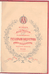 411. На память десятилетия со дня назначения государыни императрицы Марии Федоровны первым шефом полка, 2 марта 1881 года-2 марта 1891 года. – Б.м.(СПб.) : Б.и.(Тип. Р.Голике), Б. г.(1891). – 87с. : ил., [2] л. портр. – Содерж.: Нижним чинам кавалергардам. – С.5-8; Царь. Отечество-сила русского государства. – С.9-12; Основы воинской службы. – С.13-33;Солдатская полковая жизнь, советы, разъяснения и указания. – С.34-57; Главные события из прошлого кавалергардов. – С.58-83. – На авантитуле дарств. надпись сост.: «Младшему товарищу Владимиру Николаевичу Брянчанинову, от составителя. Полк. Д. Я. Дашков. 6 Дек. 1896 г.»