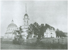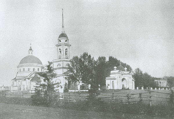 | Спасская церковь и ворота в имении Спасское-Куркино. Не сохранились. Фото начала 20 века. Из школьного музея села Куркино. |