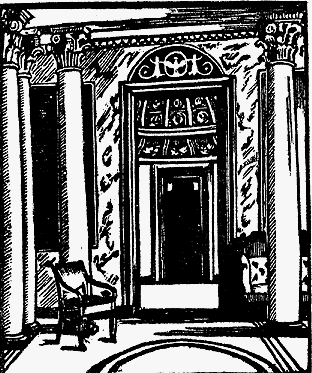 Колонный зал в с. Никольском. Линогравюра Н. Дмитревского по его же акварели
