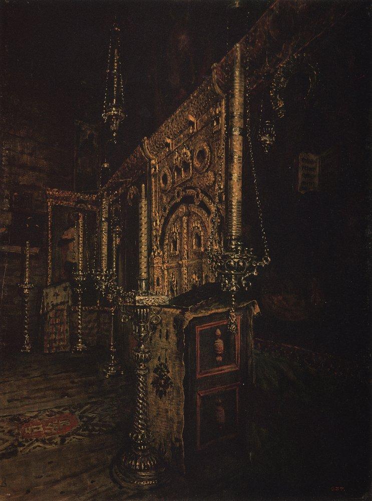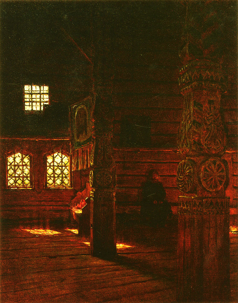 Внутренний вид деревянной церкви Петра и Павла в Пучуге. 1894 //Завадская Е. Василий Васильевич Верещагин. – М., 1986