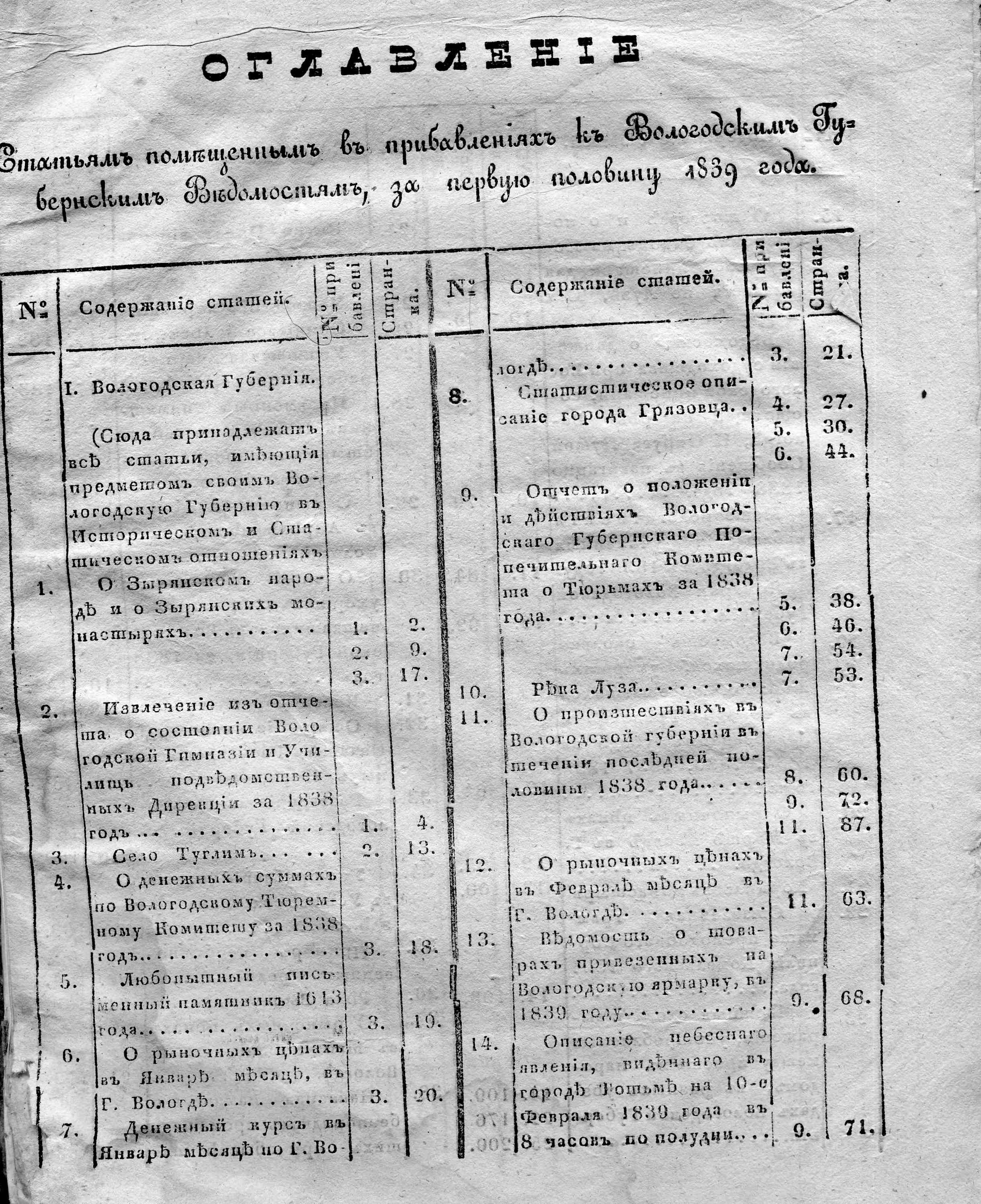 Вологодские губернские ведомости. Газета. 1839 год, Неофициальная часть: Оглавление страница 1