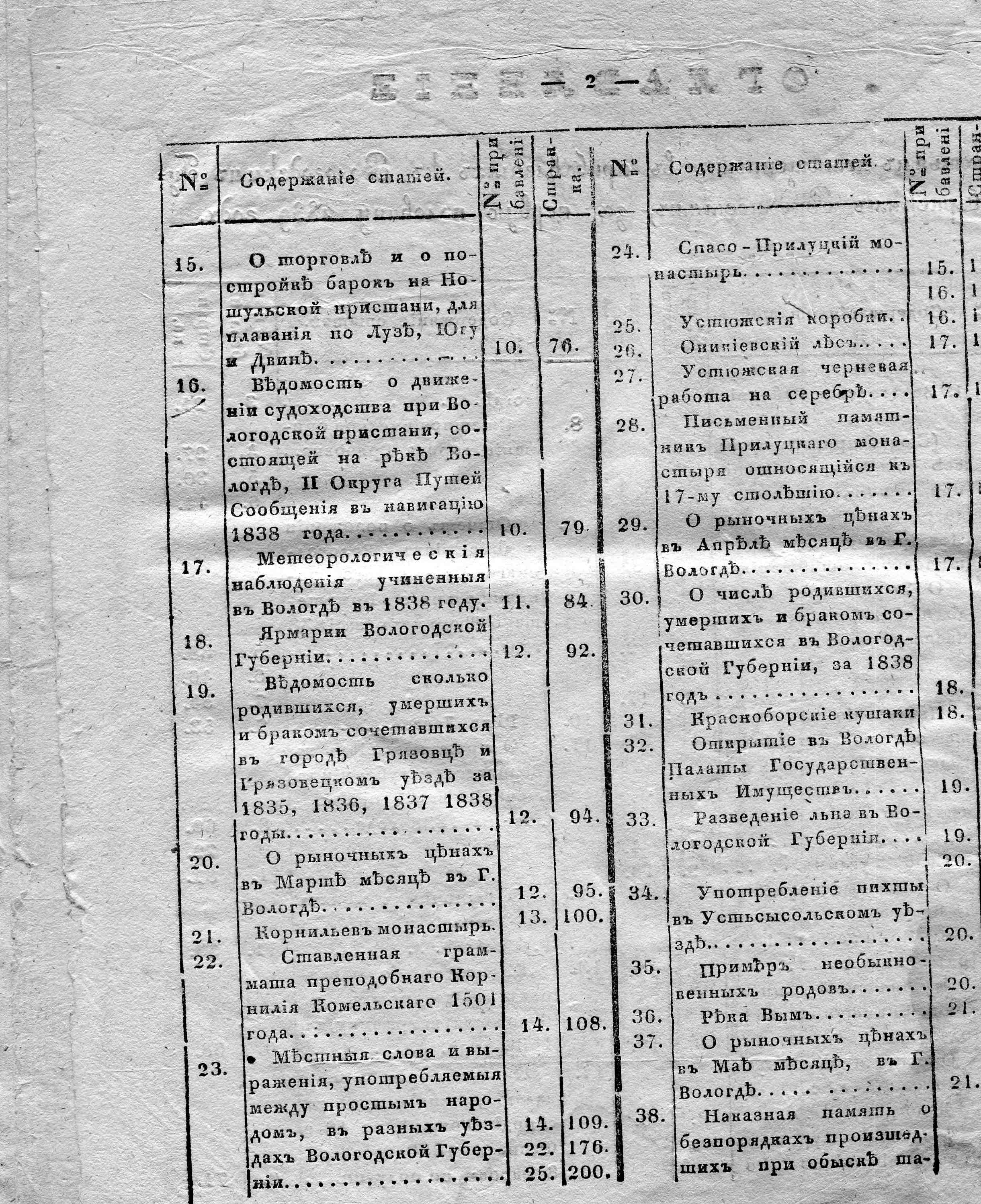 Вологодские губернские ведомости. Газета. 1839 год, Неофициальная часть: Оглавление страница 2