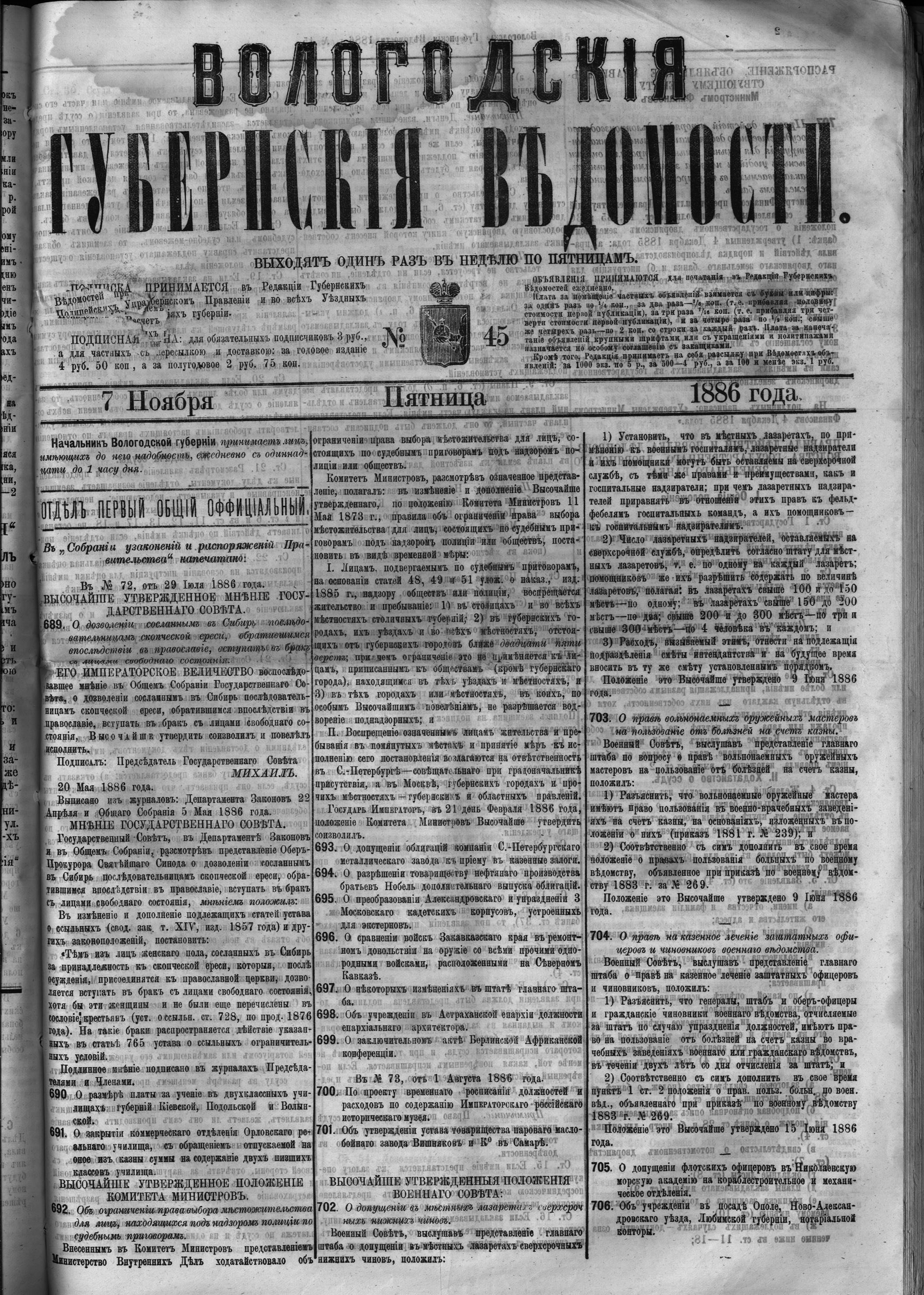 Вологодские губернские ведомости. Газета. 1886 год, №45 страница 0