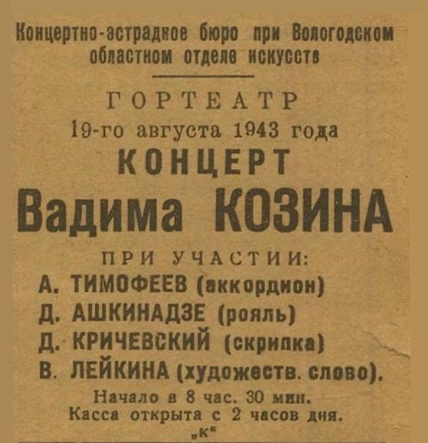 Концерты мастеров искусства // Красный Север. – Вологда, 1944. – 6 августа (№ 155). – С. 1.
