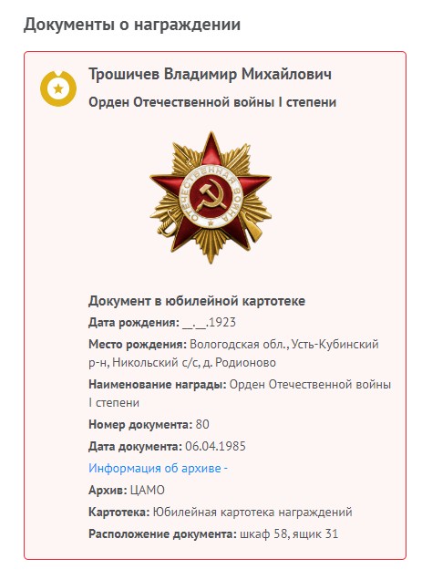 Трошичев Владимир Михайлович на сайте «Память народа»